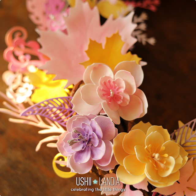 Leaves are made of paper, and flowers are made of foamiran. Maybe it's not a typical autumn color palette, but... I was in pinkish-yellow mood :D